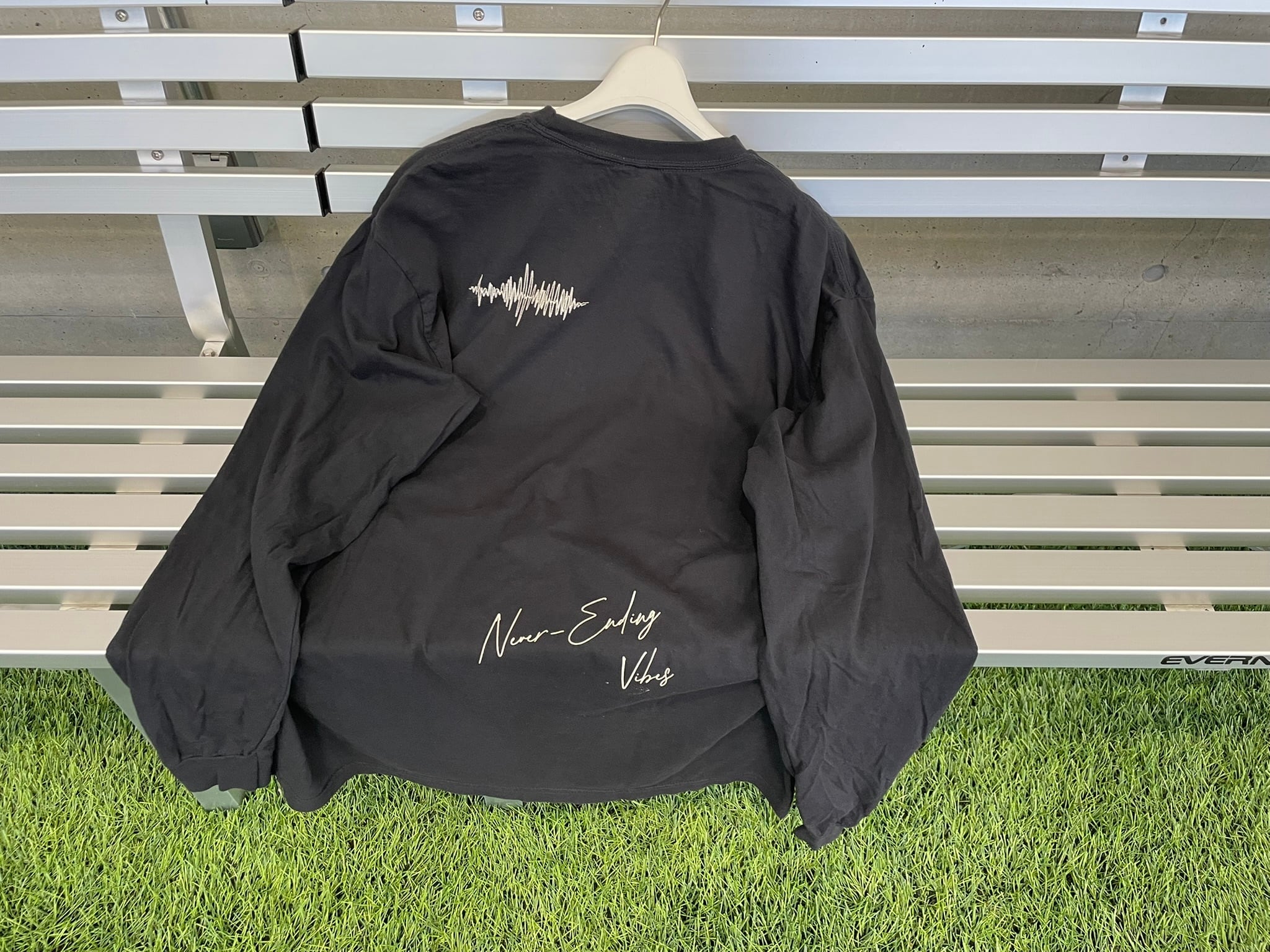 バックプリントには"NEVER ENDING VIBES"の文字と”波形”を入れてます。