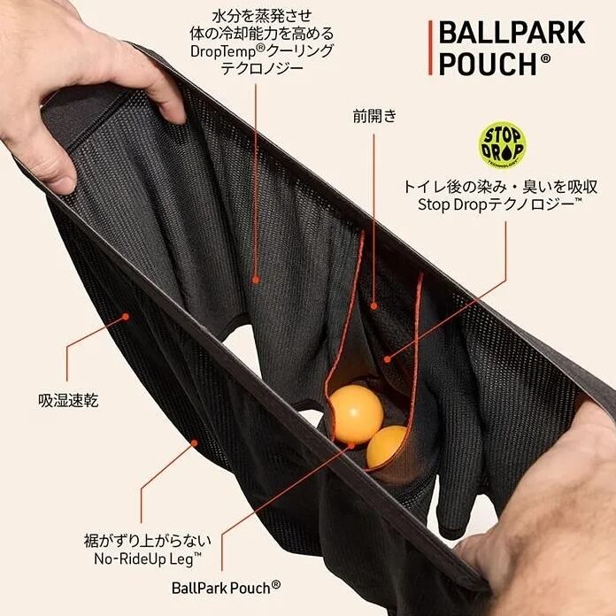 BallPark Pouch(R)に加え、裾がずり上がらないNo-Rideup Leg、トイレ後のシミと臭いを防止するStop Drop Technology、そして汗の力で蒸発冷却しインナー全体を冷やす独自テクノロジー「Droptemp Cooling Technology」を搭載。
