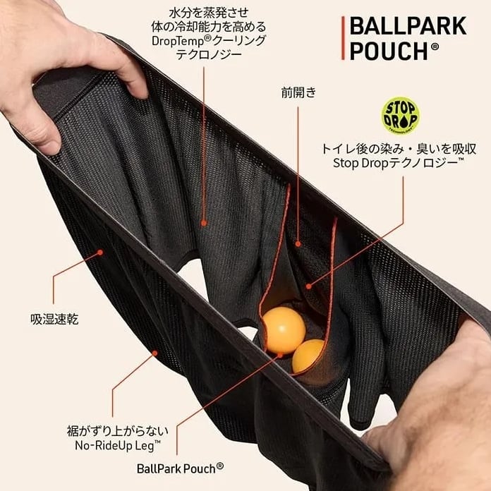 防臭、裾がずり上がらないNo-Rideup Leg、トイレ後のシミと臭いを防止するStop Drop Technology、そしてBallPark Pouch(R)を備えています。